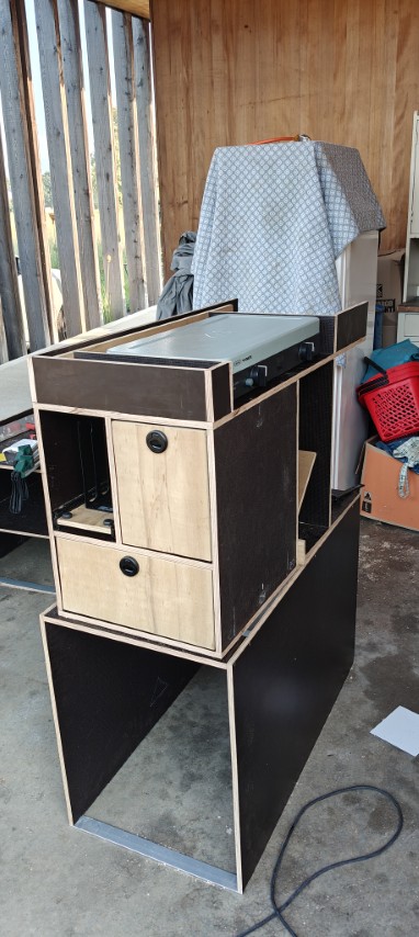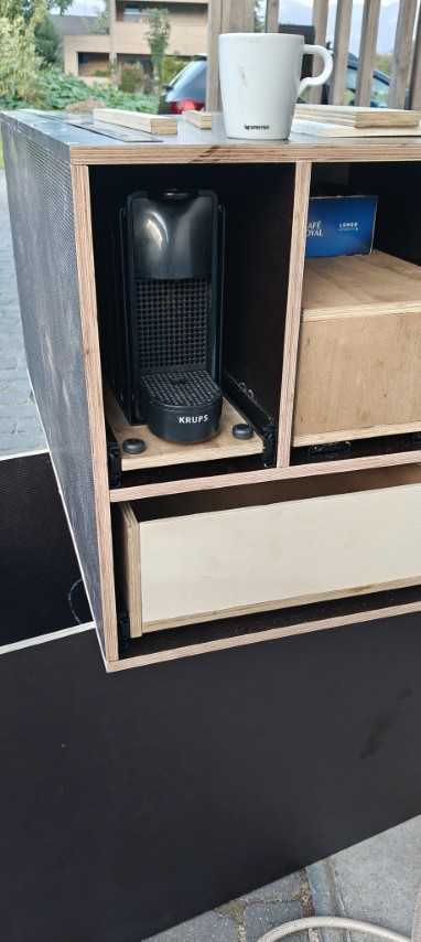 - fest verbaute Kaffeemaschine mit Schubladen für Tassen, Zucker, Kaffeetabs und Becher